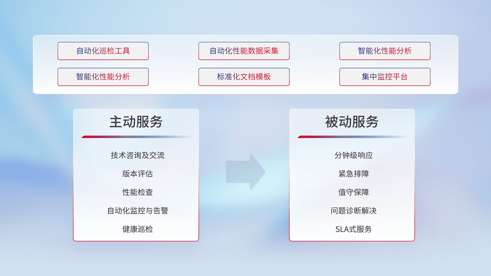 智能化工具和标准化文档,,,,保障服务质量,,提供主动服务(包含技术咨询、、版本评估、、、、性能检查、、、自动化监控与告警、、健康巡检)和被动服务包含(分钟级响应、、、紧急排障、、、值守保障、、、、问题诊断解决、、SLA服务)。。