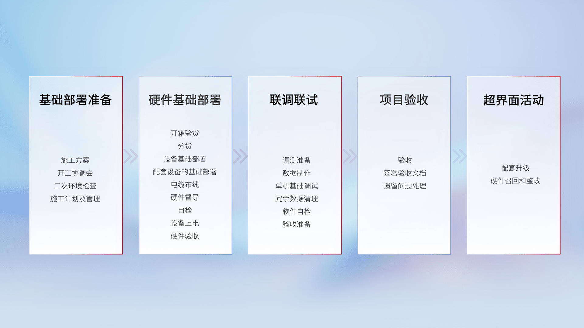 从基础部署准备、、、硬件基础部署、、、、联调联试、、、项目验收、、越界面活动的全过程可追溯,,保证施工质量和进度。。。
